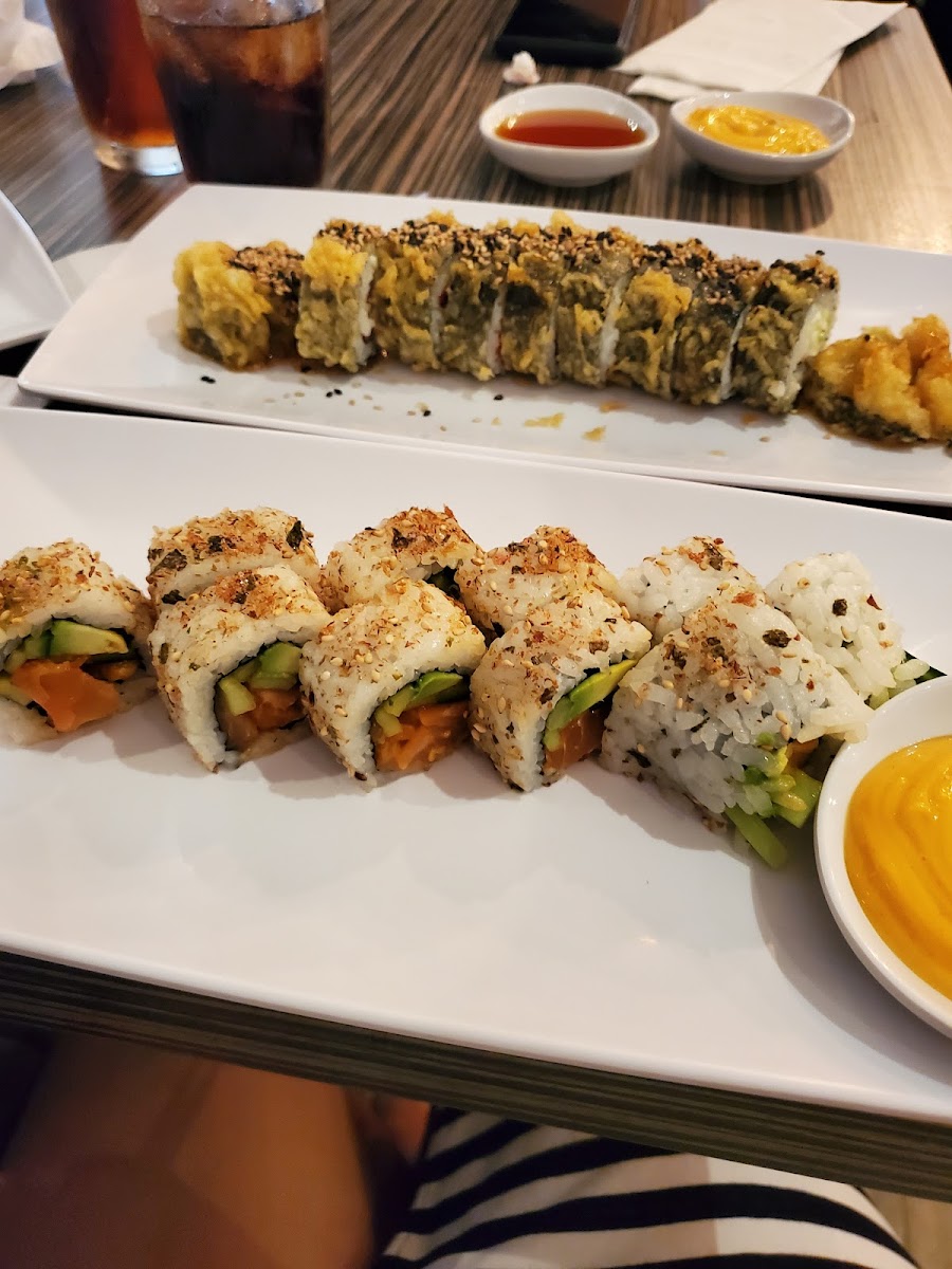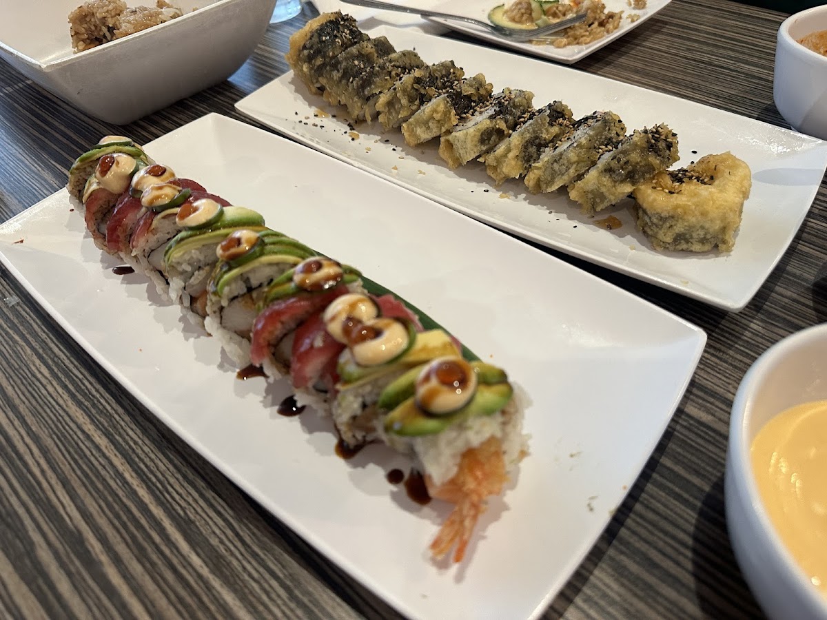 Menu highlights include an assortment of specialty rolls such as the Angel Roll (fresh salmon, tuna, ikura, and a blend of sauces) and the Alaskan Roll, which features salmon, cream cheese, spicy mayo, and tempura crumbs for texture. Beyond sushi, the grilled teriyaki bowls with beef and chicken stand out as popular choices, especially paired with traditional sides like miso soup and fresh edamame. Sauces are a local favorite, offering a nice variety from spicy mayo to ponzu, which adds a customizable element to the dishes.